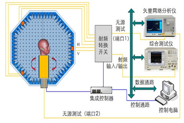 测试项目包含有源测试:SISO/SIMO/MIMO的总辐射功率(TRP)、总全向灵敏度(TIS)、数据吞吐量(TPUT),无源测试:天线效率、分集增益。