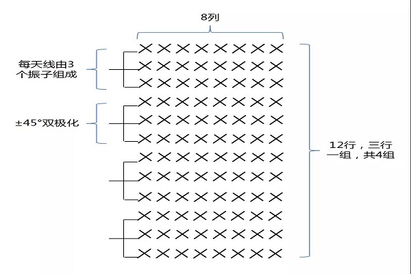 以下图的M-MIMO天线振子排布图为例,水平方向共12行,垂直方向有8列振子,再加上±45°双极化,一共就有12x8x2=192个振子。