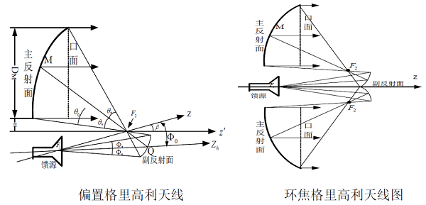 然而,这样的馈源放置方式明显对到达主反射面的电磁波产生了遮挡,为了克服遮挡效果,又对天线的放置位置做出了改进,发展出了如偏置双反射面天线和环焦天线,如下图所示: