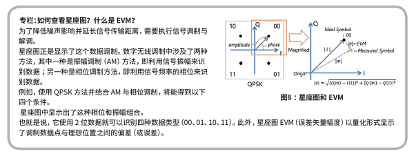 这两个项目测量 WLAN 信号的 EVM,以检查信号质量。EVM(误差向量幅度)是一个向量在理想的星座图上的点和由接收器接收的点之间的差异(包括幅度和相位的矢量)。星座图的详细信息请参阅本节末尾的专栏。由于 EVM 是一个会受上述测量结果(例如功率、频率、噪声等)影响的复合值,因此尽管 EVM 表现不佳也可以认为是由多种原因引起的,但它确实可以在评估 EVM 表现不佳的原因时发挥一定的作用,并提供一些关于应对措施的提示
