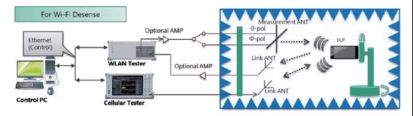 鉴于 WLAN 信号比较接近蜂窝系统的上行频率,有时灵敏度可能会因蜂窝信号的干扰以及前端过载和带外辐射的影响而降低。该项测试评估在一个受到蜂窝信号干扰以及运行中蜂窝设备辐射影响的环境中,WLAN 产品能否保持正常的接收灵敏度。具体而言,这里将使用 WLAN 测试仪、蜂窝基站模拟器以及暗室来与 DUT 建立蜂窝连接。在蜂窝信号引起干扰的同时,测量WLAN 产品的有效全向辐射功率(EIRP)。